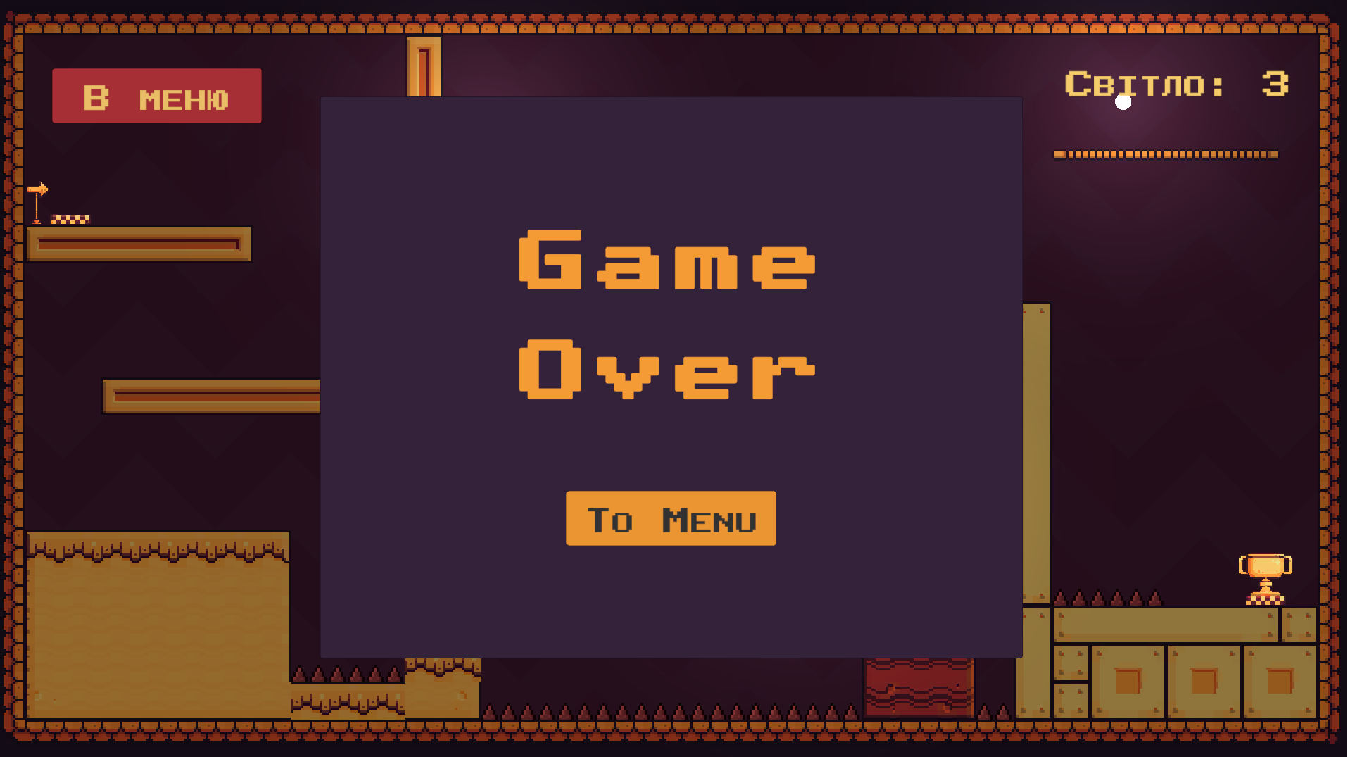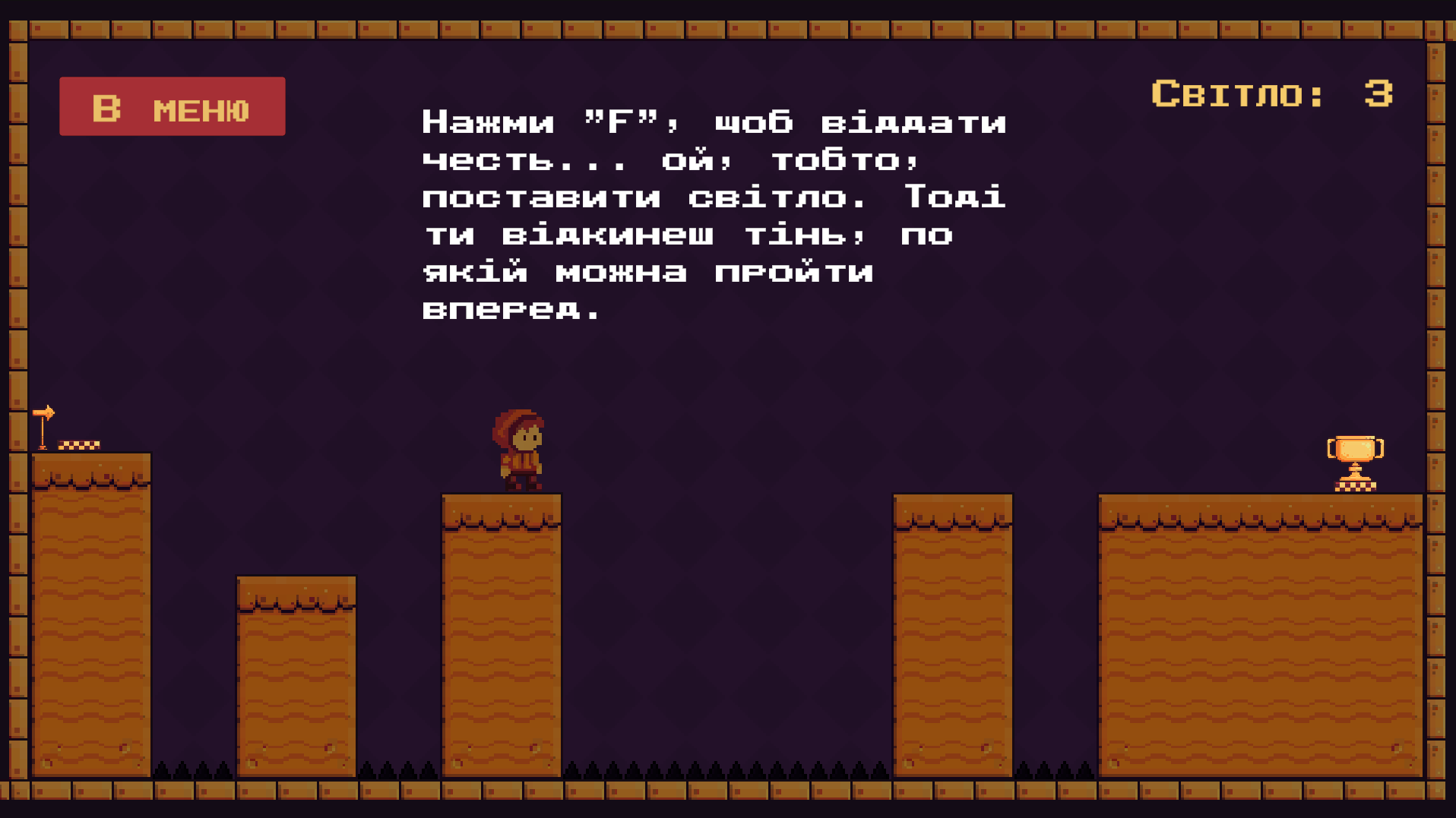Світлоносець — це платформер, де світло стає твоєю єдиною зброєю проти темряви. Кожен крок уперед вимагає жертви: ти розставляєш джерела світла, а твоя тінь перетворюється на платформи. Але час не на твоєму боці: зверху сиплються небезпечні об’єкти, під ногами — шипи та безодні, а запас світла обмежений. Твоє завдання — ухилятися, планувати й обирати, де залишити світло, щоб пройти далі.